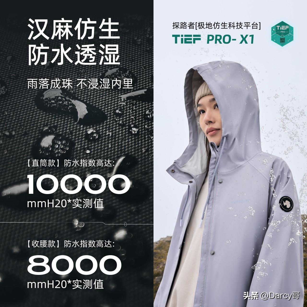 该款冲锋衣采用探路者[极地仿生科技平台]TIEF PRO- X1,防水指数达到8000mm以上,透湿指数达到8000g/m2/24h以上。