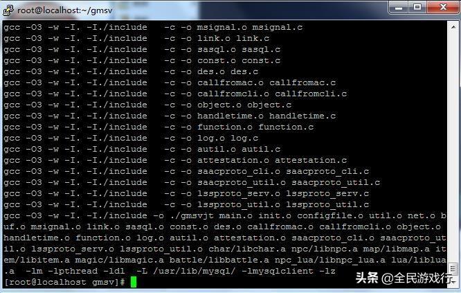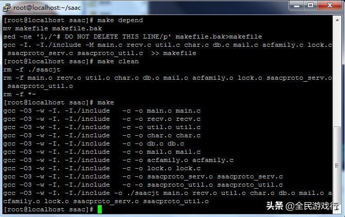 如果是第一次编译石器时代代码的,最好一开始就要用make depend ,如果以前有编译过的,那样最好要清除一下编译完成文件,用make clean,这样就能直接用make 编译了,如果编译成功会显示一个saacjt和gmsvjt文件,我把编译的截图给大家看看!