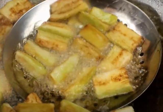3.茄子裹上淀粉热油炸,炸至微焦后捞出。