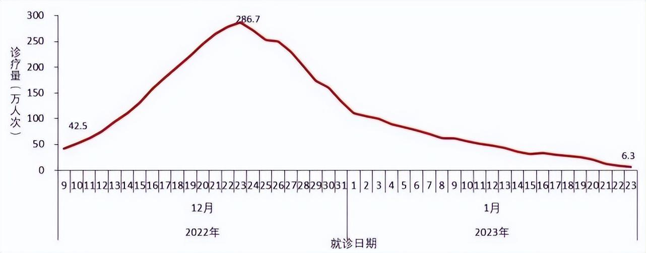 全国(不含港澳台)发热门诊(诊室)就诊人数于2022年12月23日达到峰值286.7万人次,随后连续下降,2023年1月23日下降到6.3万人次,较峰值下降了97.8%(图2-1)。